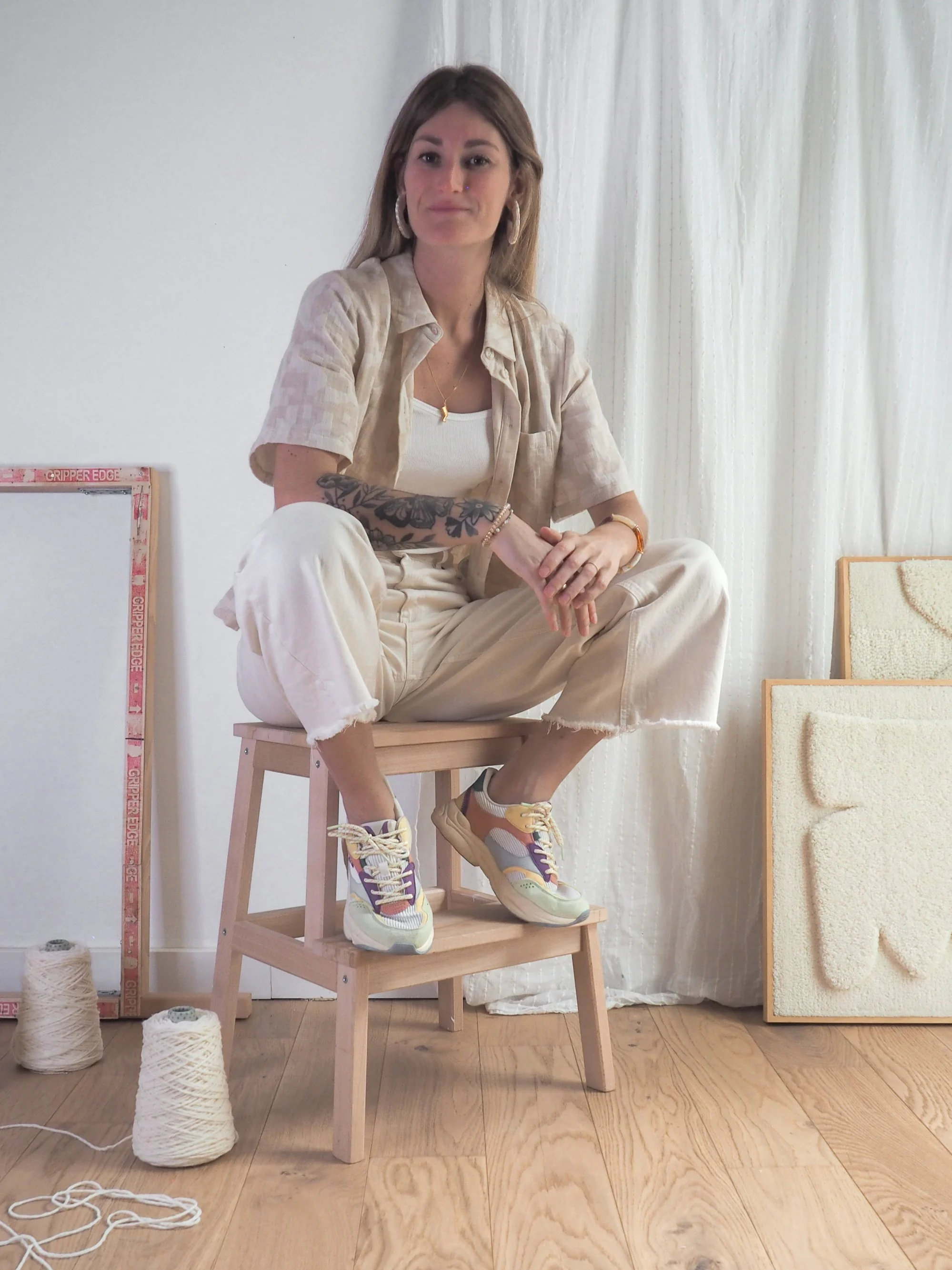 Elle crée des tableaux et des tapisseries en laine, qu’elle travaille à l’aide de différentes techniques et outils. Cette approche lui permet d’explorer librement textures, volumes et formes, dans un rapport direct et intuitif à la matière.